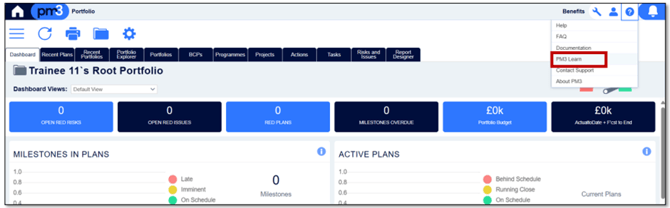Open PM3Learn from PM3- In PM3 select the question mark icon at the top right then choose PM3Learn