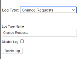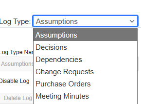 Decisions, Dependencies, Assumptions and custom Logs . This screen allows the user to create/update new log types. Custom columns can be added/removed from the respective Log screens. Decisions, Dependencies and Assumptions are mandatory logs for which name cannot be changed and logs cannot be deleted/disabled.