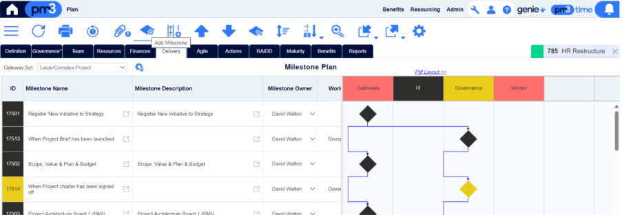 Open a Plan and under the Delivery tab, click Milestone Plan. Click add milestone icon (Blue diamond) from the Tool ribbon. A milestone will be created at the bottom of the milestone table and automatically saved. Please wait for the Saving icon to complete (bottom right corner) before entering details into the row.