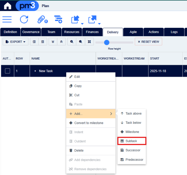 - Right click on the row you wish to convert to a Summary Task and in the context menu, click Add -> Subtask