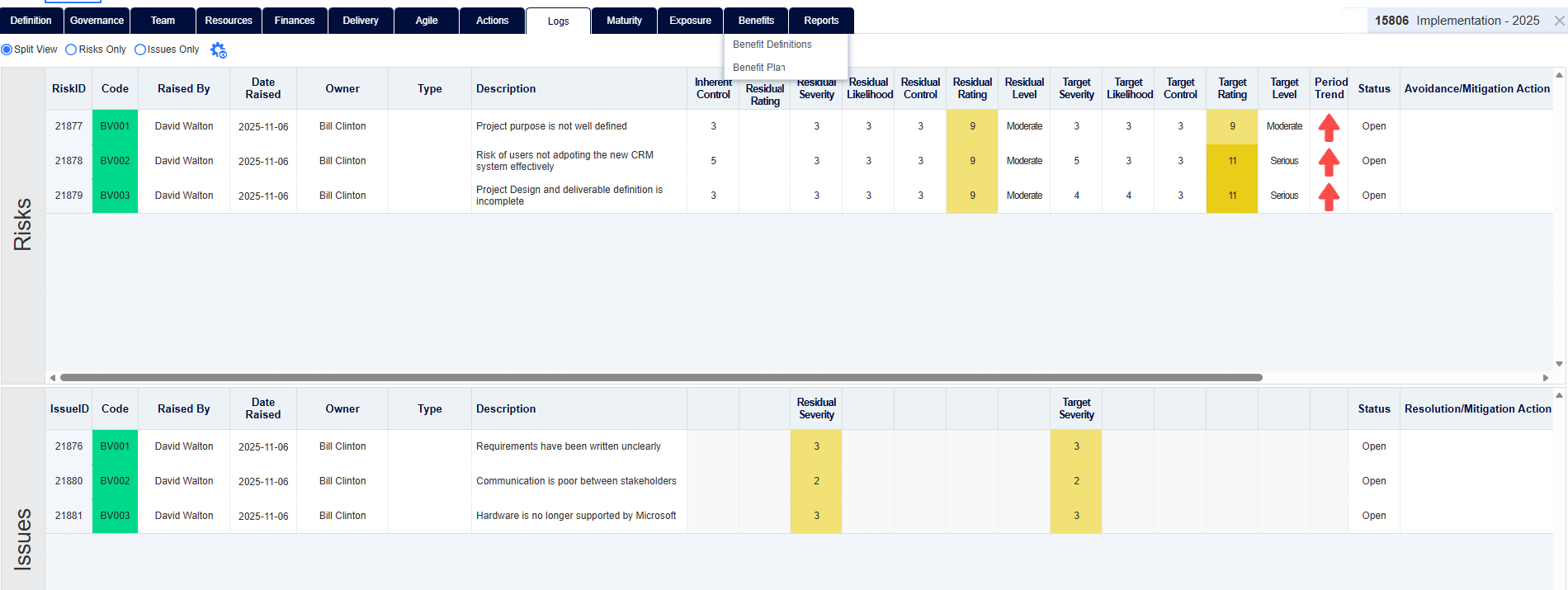 NB: Residual means ‘after the mitigation actions performed so far’, not ‘even if all the mitigation actions are performed’; so initially Inherent = Residual. But as mitigation actions progress the Residual Severity/Impact reduces. NB: Inherent Severity/Likelihood can only be amended if the Plan’s Workflow Status is Proposed or Approved.