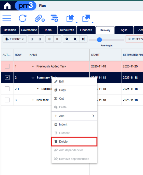 Gantt Chart - Delete Summary Task Open the project plan on the Delivery / Gantt Chart sub-tab Select the Summary Task row, right click delete. This will delete the Summary Task and ALL child rows under it.