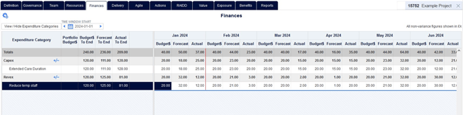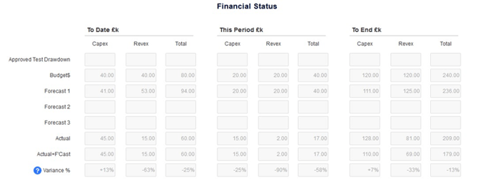 The Financial Status within the Governance tab allows you to define and maintain the Revenue and Capital expenditure Targets, Forecasts and Actuals of Projects. Note that these financial values are 'rolled up' into parent Plans (so, for example, the Finances tab of a Programme will sum the Finances tabs of all its dependent Projects).