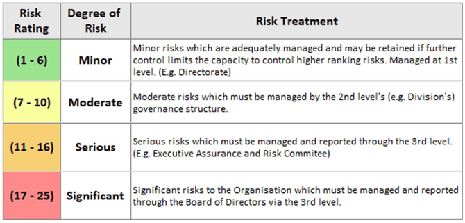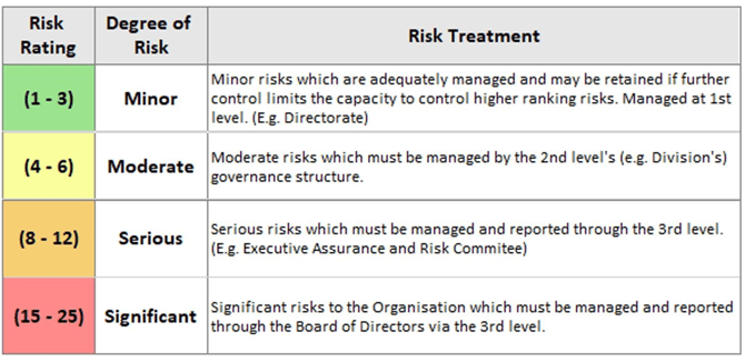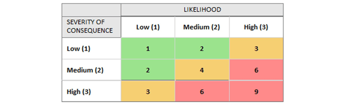 The Risk Rating is numerical value from 1-9, 1-25 or 3-15 (according to which risk matrix is in effect). It is the product of the Risk Likelihood and Severity rating values.
