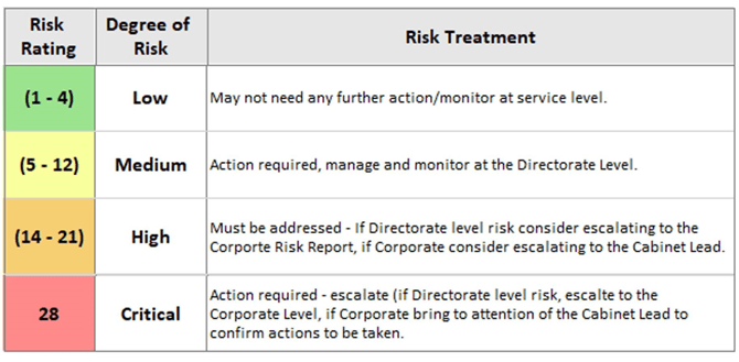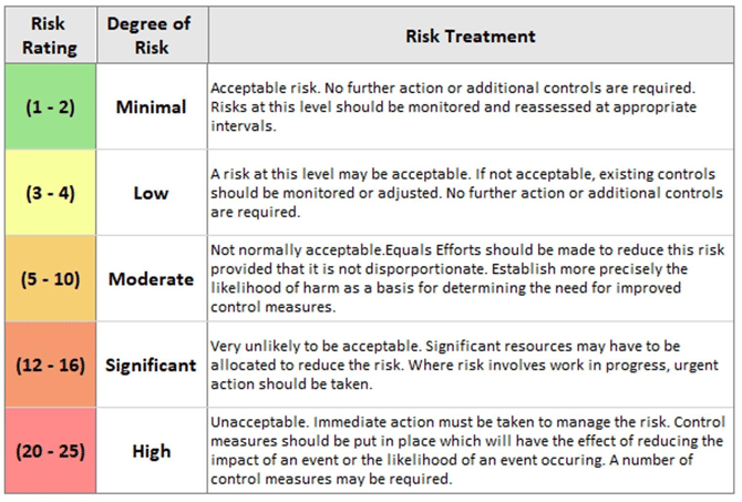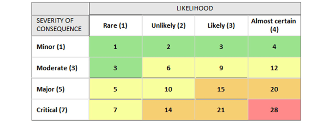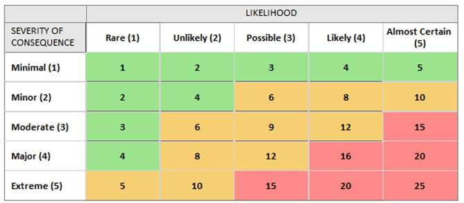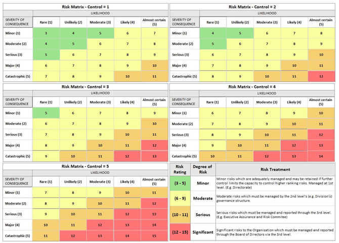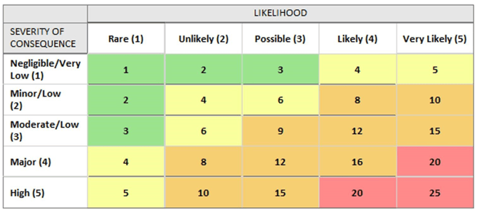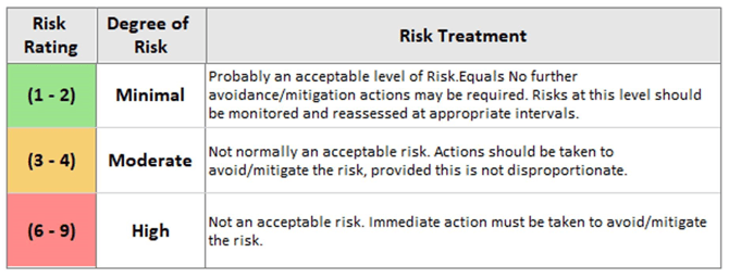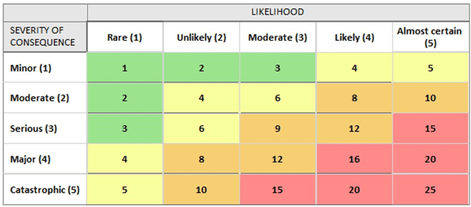 The first table for each matrix type shows the overall rating and colour of the risk, depending on what Likelihood and Severity values would be selected. The second table states what the Risk Rating means in practice.