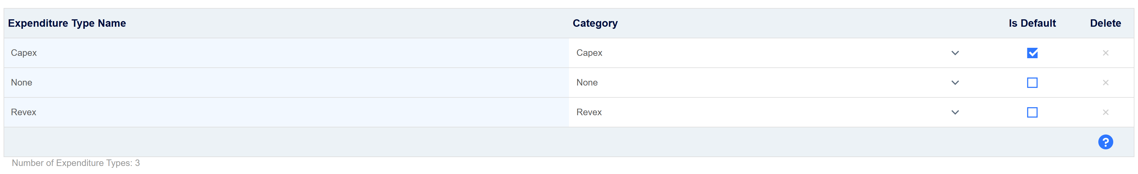The other functionality on this screen is for defining custom expenditure types. These can be assigned against tasks on the Task Edit screen(s), and are used to denote the type of payment expected from the task. The expenditure type set to Default will be used on any newly created tasks. All expenditure types defined within the system must fall under either Capex or Revex for categorisation.