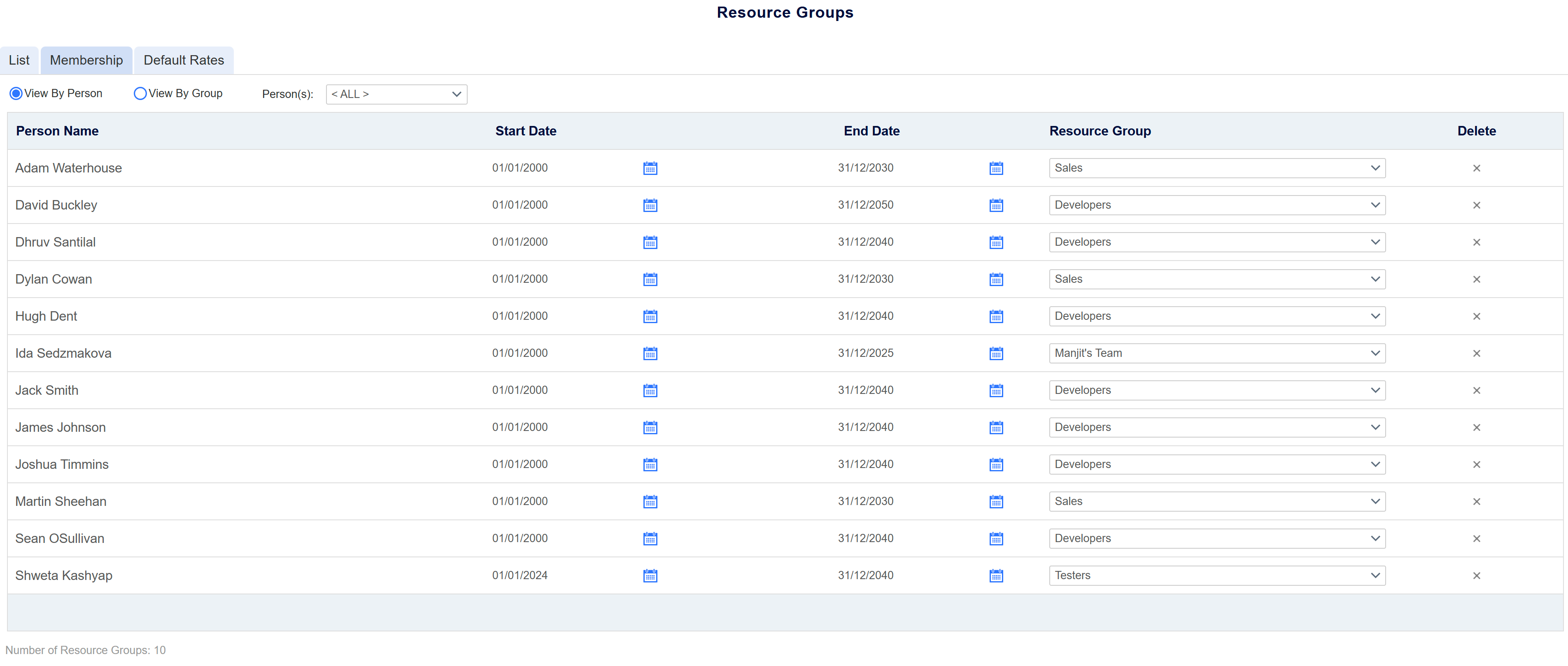 To do so, click the 'Add Member' icon in the tool ribbon, and in the newly created row in the table, select the Person the Resource Group will be assigned to, and the Resource Group itself, along with Start and End Date of this person’s membership to the resource group. Clicking Save will increment the count of people assigned to the resource group that is visible on the List subtab.