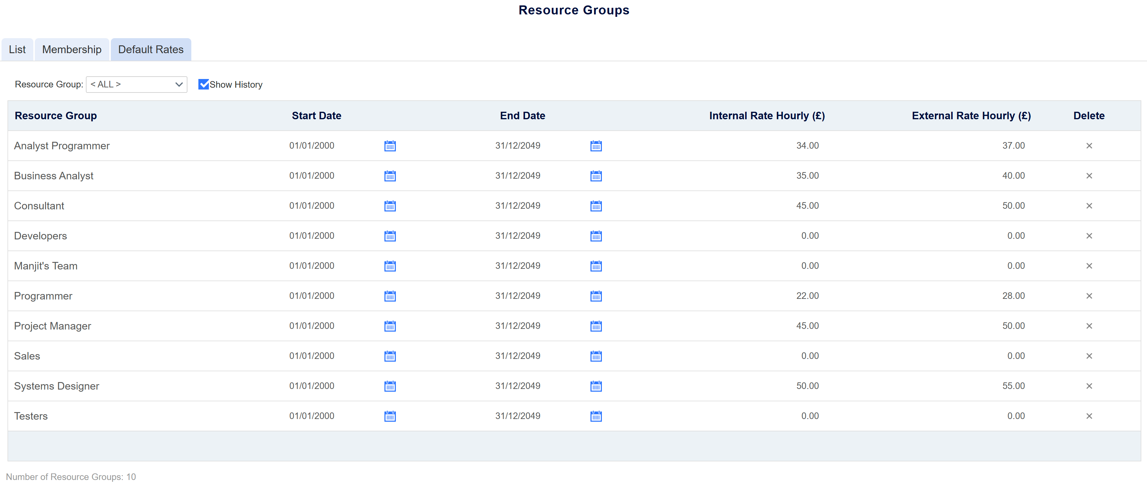 To add a new default rate for a Resource Group, click the Add Rate icon in the tool ribbon, and in the newly created line, select the Resource Group the rate will be set against, choose the date range for the rate (this cannot overlap any other date range currently set for that Resource Group) and enter the Internal and External Hourly Rate (these can be left as 0).
