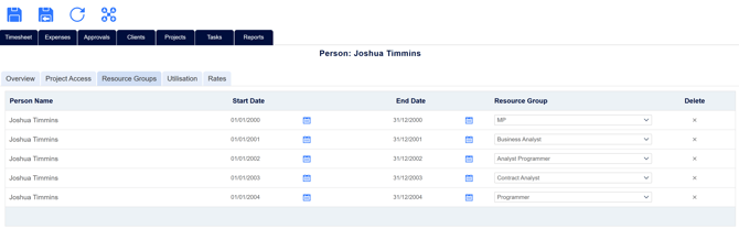 To add a new record click the ‘Add new timeslot for resource group’ button in the tool ribbon. Edit the newly-added row to specify the Resource Groups the person can belong to between which dates.