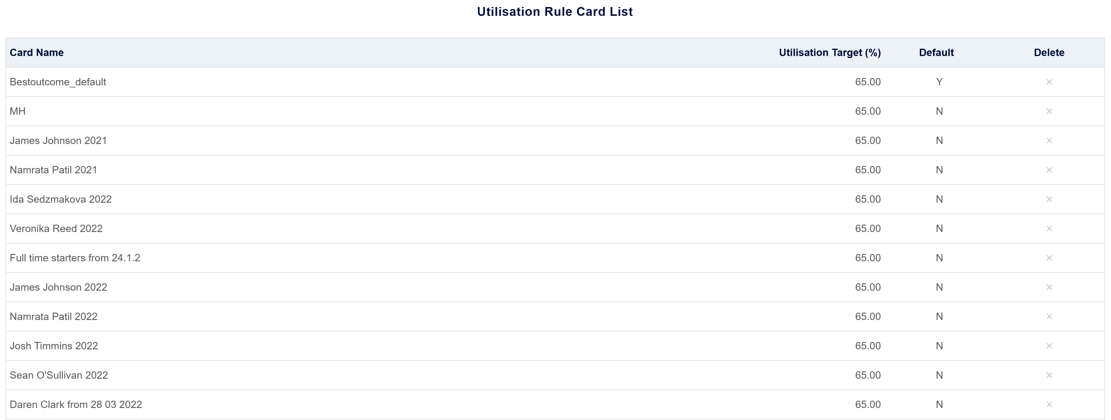 The Utilisation page allows for creating a Rate Card. Rate Cards are assigned to Persons, and detail their holiday, work patterns, non-billable tasks and their utilisation for a date range (specified on the Person > Utilisation subtab).