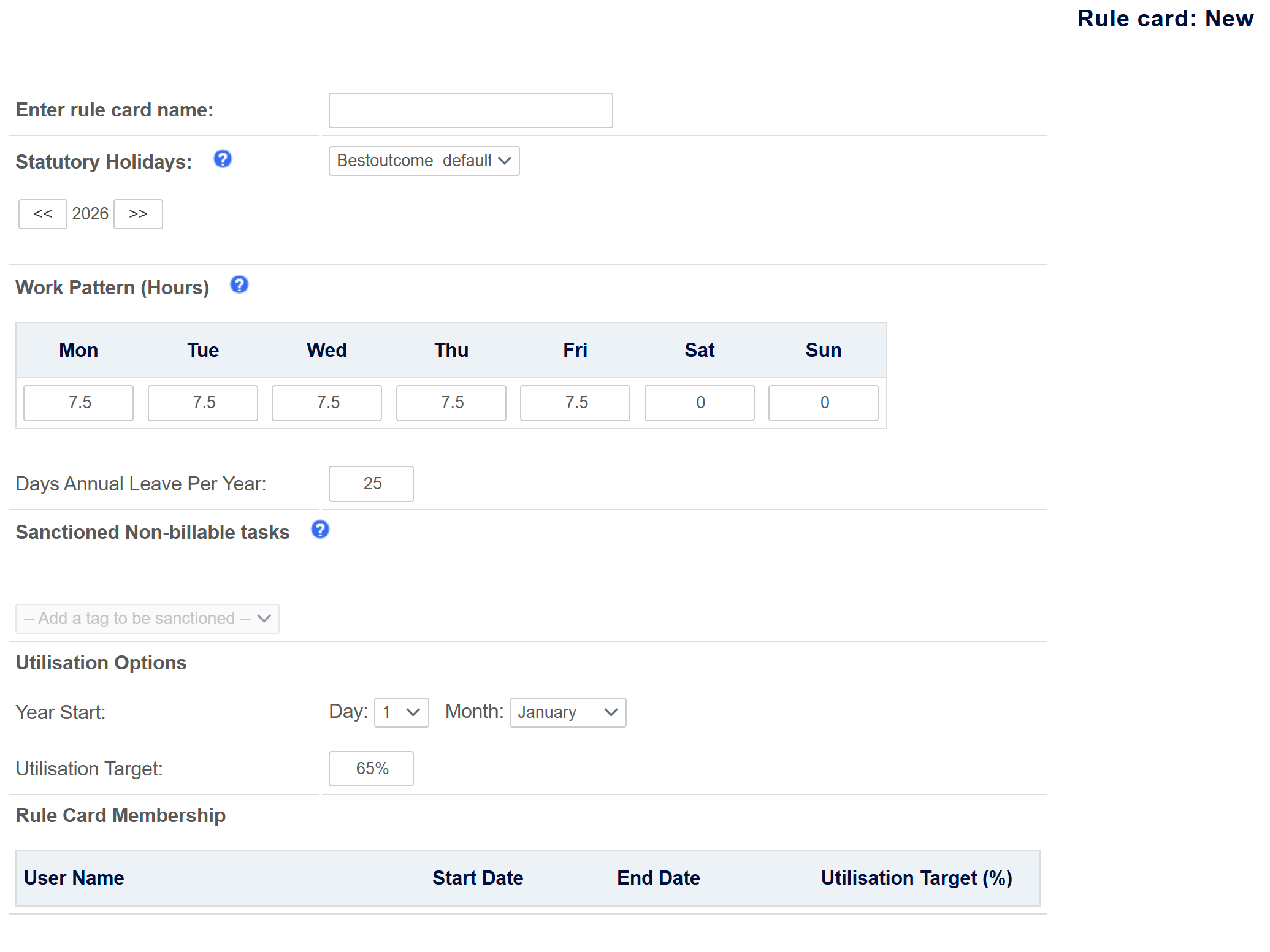 While only the name of the Rule Card is the only essential field on the rule card to fill in, the other sections should be addressed, the Statutory Holidays section allows you to set the holiday for a rule card using a holiday card (requires a Holiday Card to be created from the Admin > Statutory holidays page). The work pattern defines how a work week is defined for a relevant person, this defaults to 1 work day during each weekday. The Sanctioned Non-billable tasks sections allowing the adding Task Tags to the Rule card (note a rule card must have first been created before task tags can be added). The Utilisation Options section enables the default rate for the rule card, which after assigning to a person, can be overwritten by going to the Person > Utilisation sub tab.